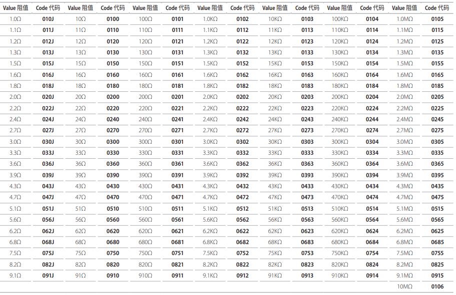 E-24 系列標(biāo)準(zhǔn)厚聲電阻阻值和料號(hào)系統(tǒng)使用代碼 ( 4 位 , 以 0 為首位 , 2%、5%、10% 公差 )