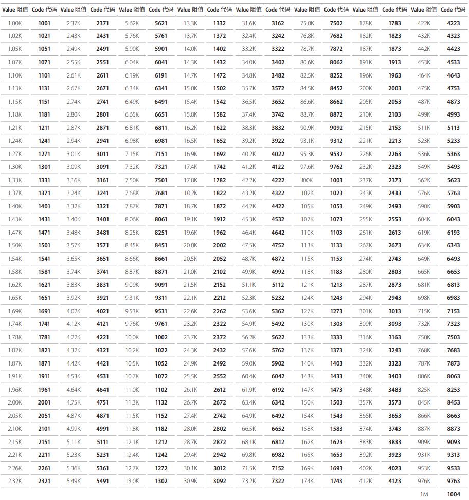 E-96系列標(biāo)準(zhǔn)厚聲電阻阻值和料號(hào)系統(tǒng)使用代碼((4 位 , 0.1%、0.25%、0.5%、1% 公差)