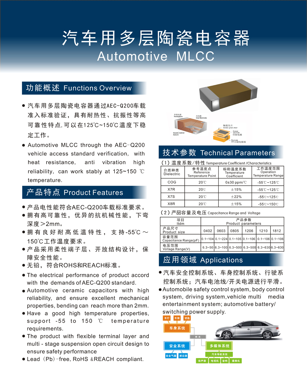 產(chǎn)品簡介:汽車用多層陶瓷電容器通過AEC-Q200車載準(zhǔn)入標(biāo)準(zhǔn)驗(yàn)證,具有耐熱性、抗振性等高可靠性特點(diǎn),可以在125℃~150℃溫度下穩(wěn)定工作。