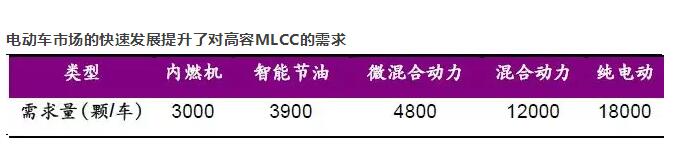 通信頻段大幅增加將帶來(lái)超小型MLCC的需求增量。相比目前滿足LTE標(biāo)準(zhǔn)的手機(jī)需要的300-500 顆貼片電容 ,到滿足LTE-advanced標(biāo)準(zhǔn)的手機(jī)需550-900顆,單機(jī)MLCC用量將提升80%以上。電動(dòng)車市場(chǎng)的快速發(fā)展提升了對(duì)高容MLCC的需求。燃油車不需要使用MLCC,而純電動(dòng)車需要使用大約18000個(gè)高容MLCC。