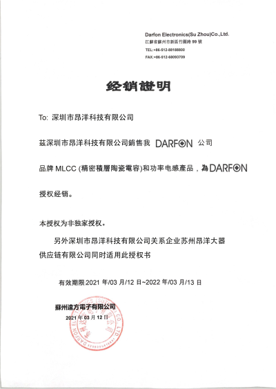 特點(diǎn)一:達(dá)方電阻代理商擁有授權(quán)證書