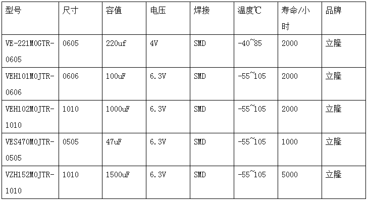 lelon(立隆)貼片鋁電解電容部分產(chǎn)品型號(hào)選型如下表